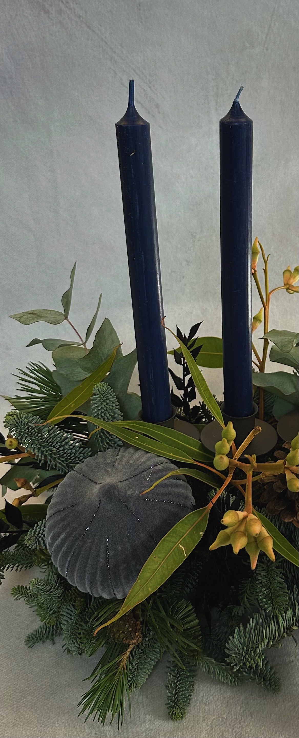 Verleihen Sie Ihrem Zuhause mit unserem Adventsgesteck "Blue Harmony" eine harmonische Atmosphäre. Die dunkelblauen Kerzen und frischen grünen Elemente schaffen eine beruhigende und natürliche Stimmung. Genießen Sie die Vorweihnachtszeit in ruhiger Harmonie.
