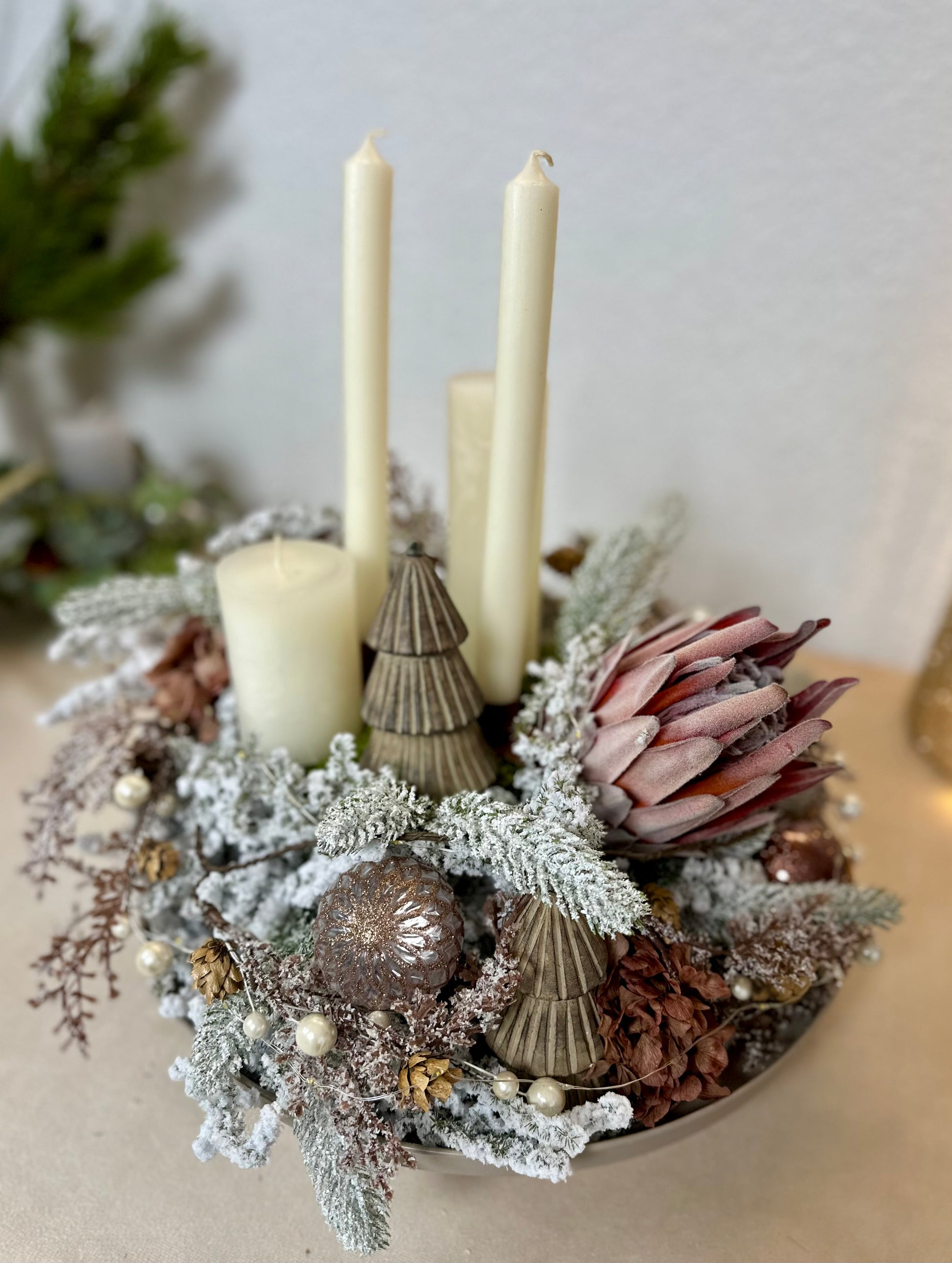 Dieser Adventskranz Naturfrost besteht aus festlichen Zweigen, die mit Schnee bedeckt sind und zusammen mit den Creme-Kerzen, braunen Deko-Materialien und der Lichterkette eine gemütliche Atmosphäre schaffen. Besonders langlebig und mit künstlichen Protea-Blüten versehen, ist er die perfekte Wahl für eine stilvolle Adventsdekoration.