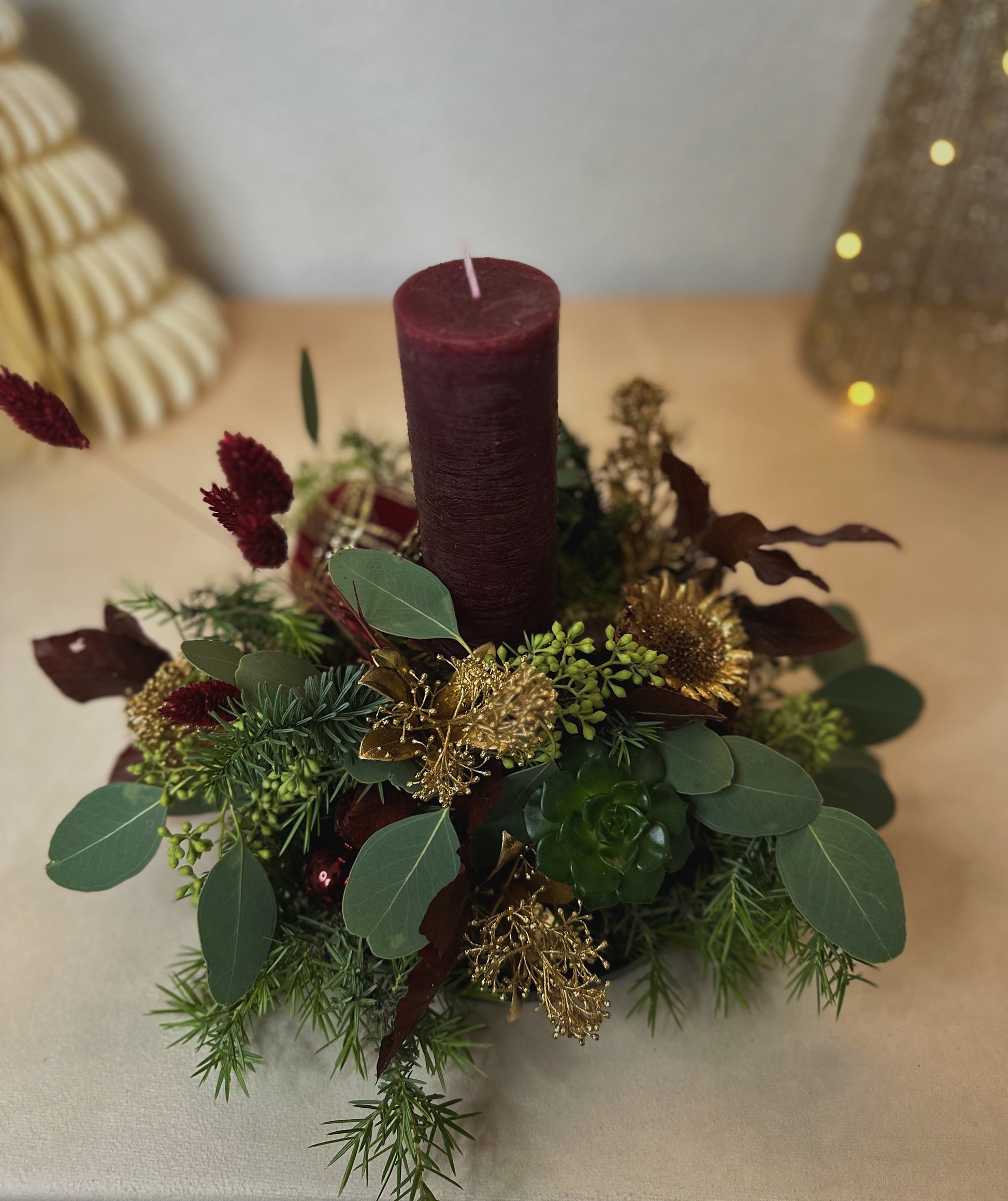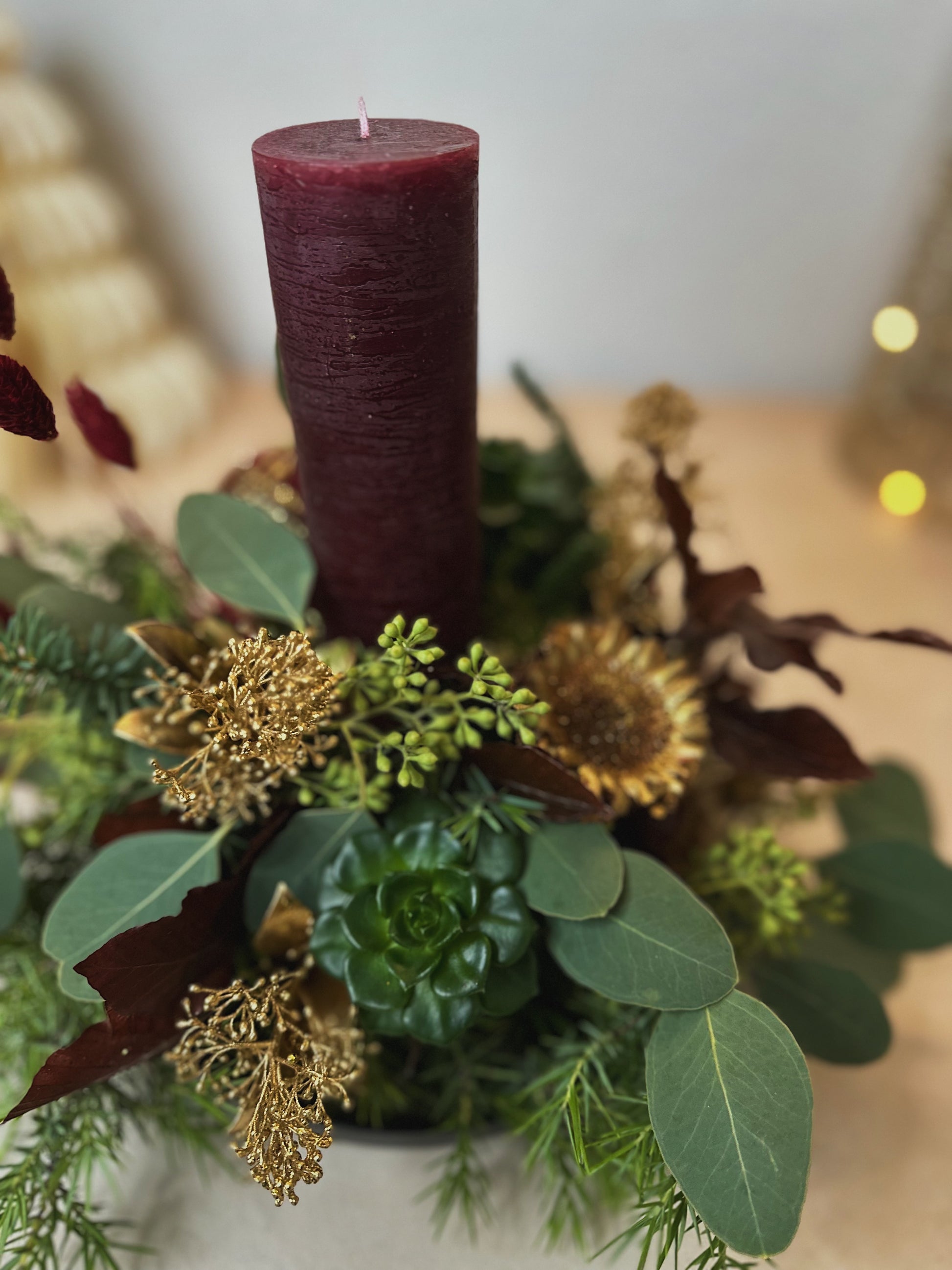 "Verbreiten Sie mit dem Adventszauber Bordeaux festliche Stimmung in Ihrem Zuhause. Dieses Gesteck mit einer Kerze, frischem Grün und einer Echeveria-Pflanze in warmen Weinrot- und Goldtönen verleiht jedem Raum eine gemütliche und edle Note."