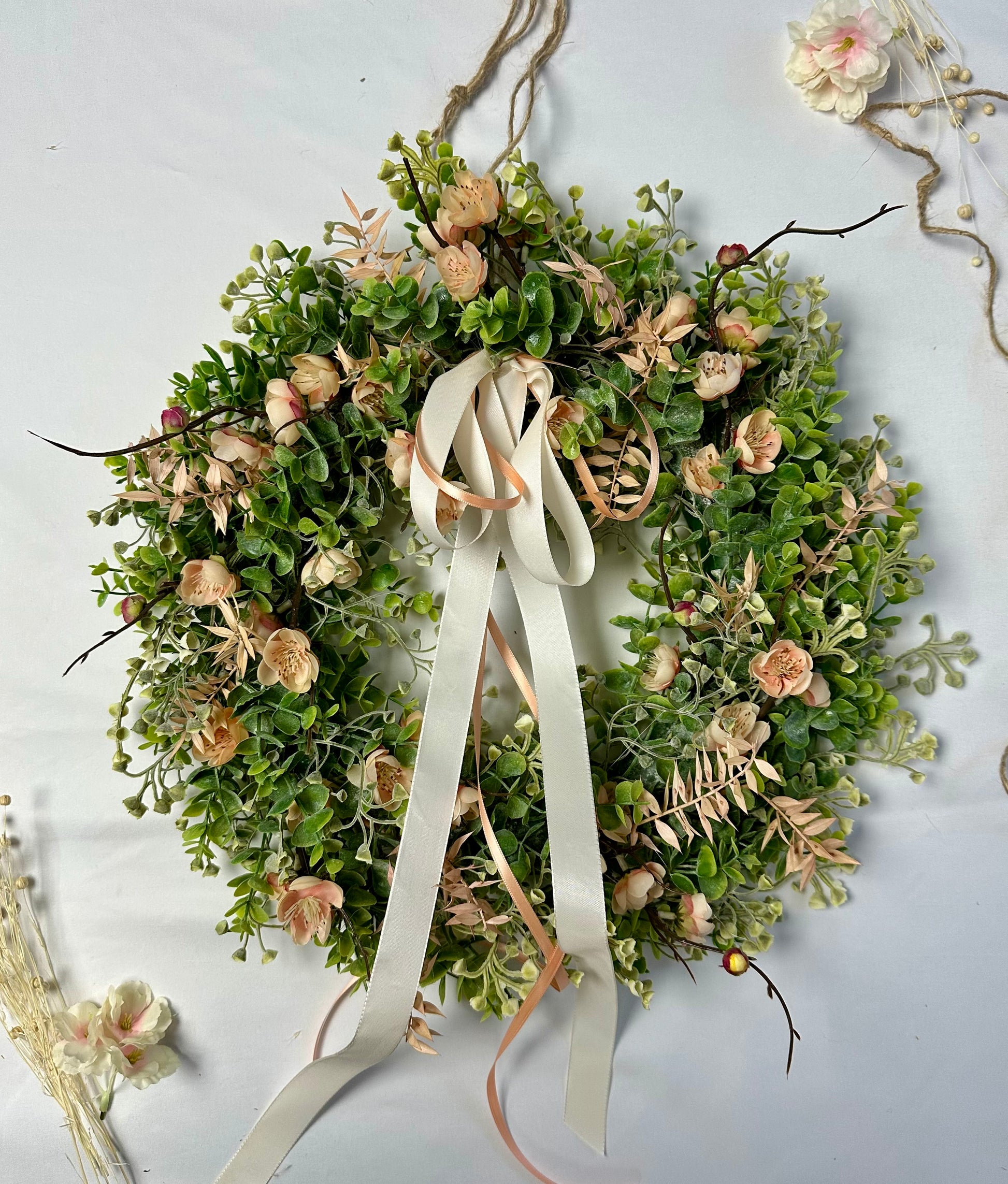 Der Apricot Romance Kranz bringt frischen Wind in Ihr Zuhause. Die harmonische Kombination aus grünem und apricotfarbenem Kunstgrün verleiht Ihrer Tür einen einladenden Charme. Ideal, um Freunde und Familie herzlich willkommen zu heißen und das Ambiente zu verschönern.