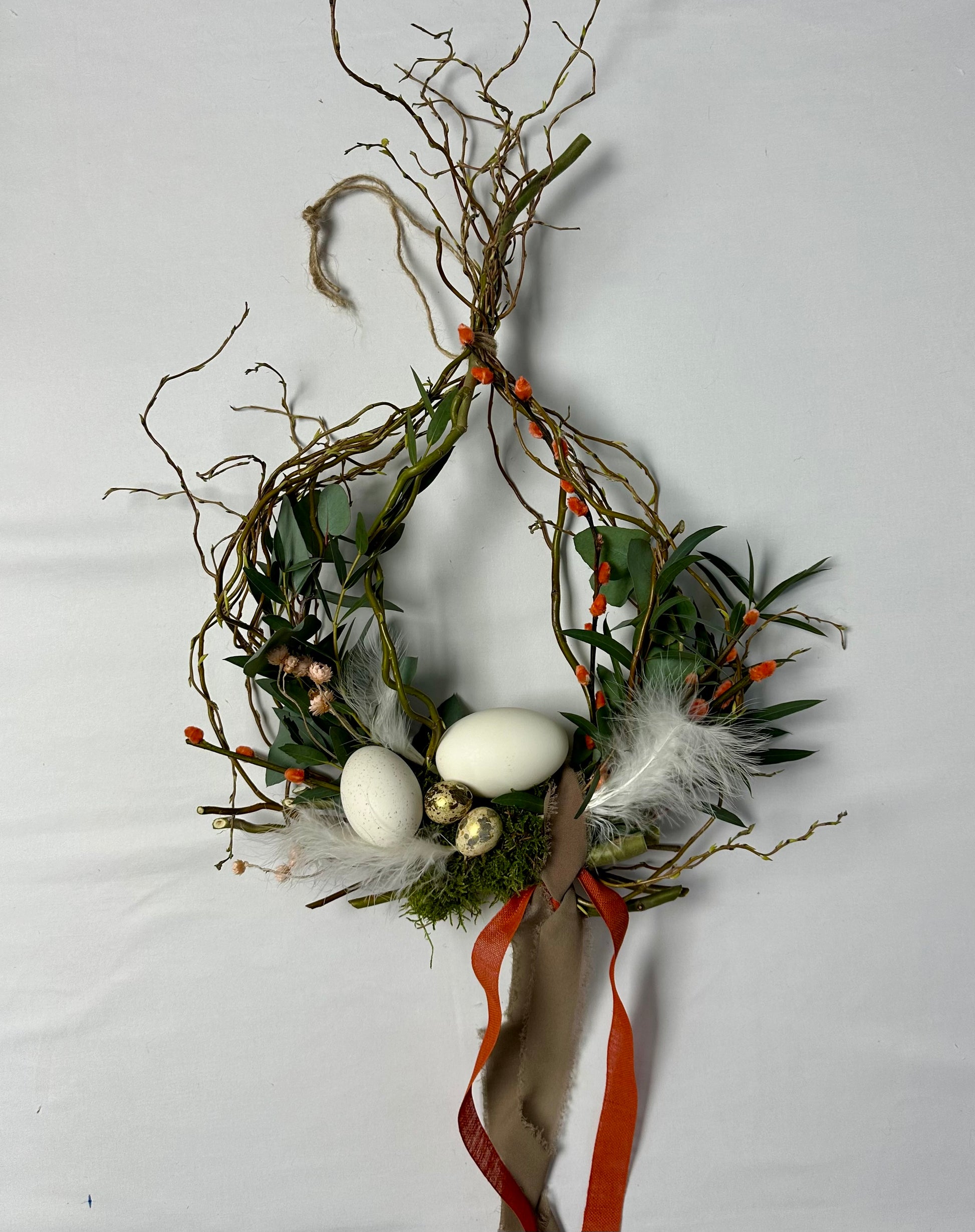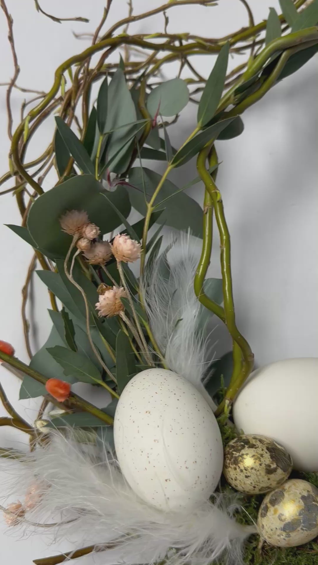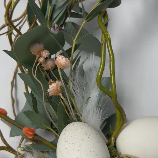 Verleihen Sie Ihrem Zuhause mit dem Türkranz Zweig & Seele einen einladenden Touch. Dieser oval geformte Kranz ist mit echten Eiern geschmückt und eignet sich perfekt als Geschenk oder um sich selbst eine Freude zu machen. Er bringt Wärme und Stil in Ihren Eingangsbereich.