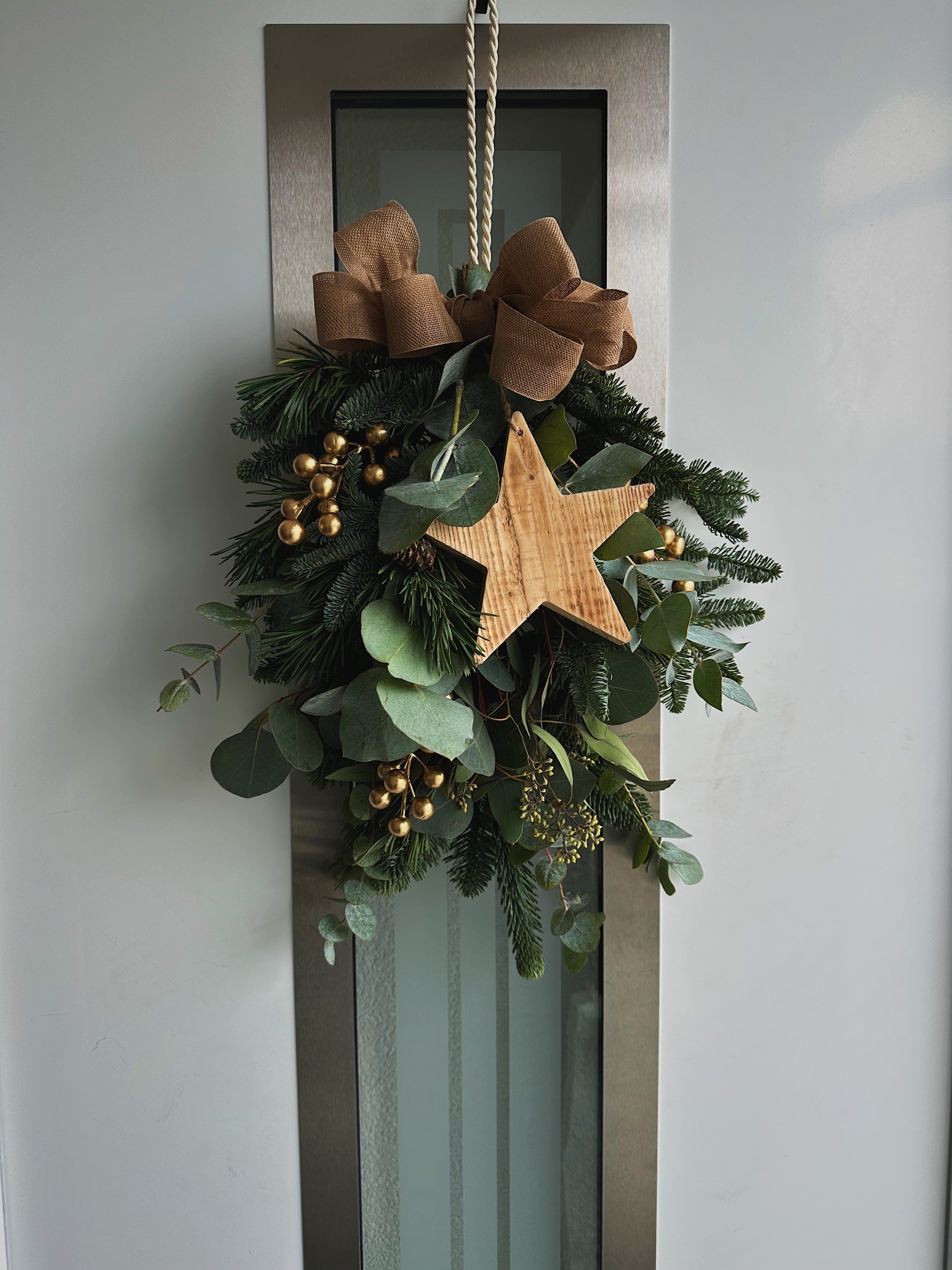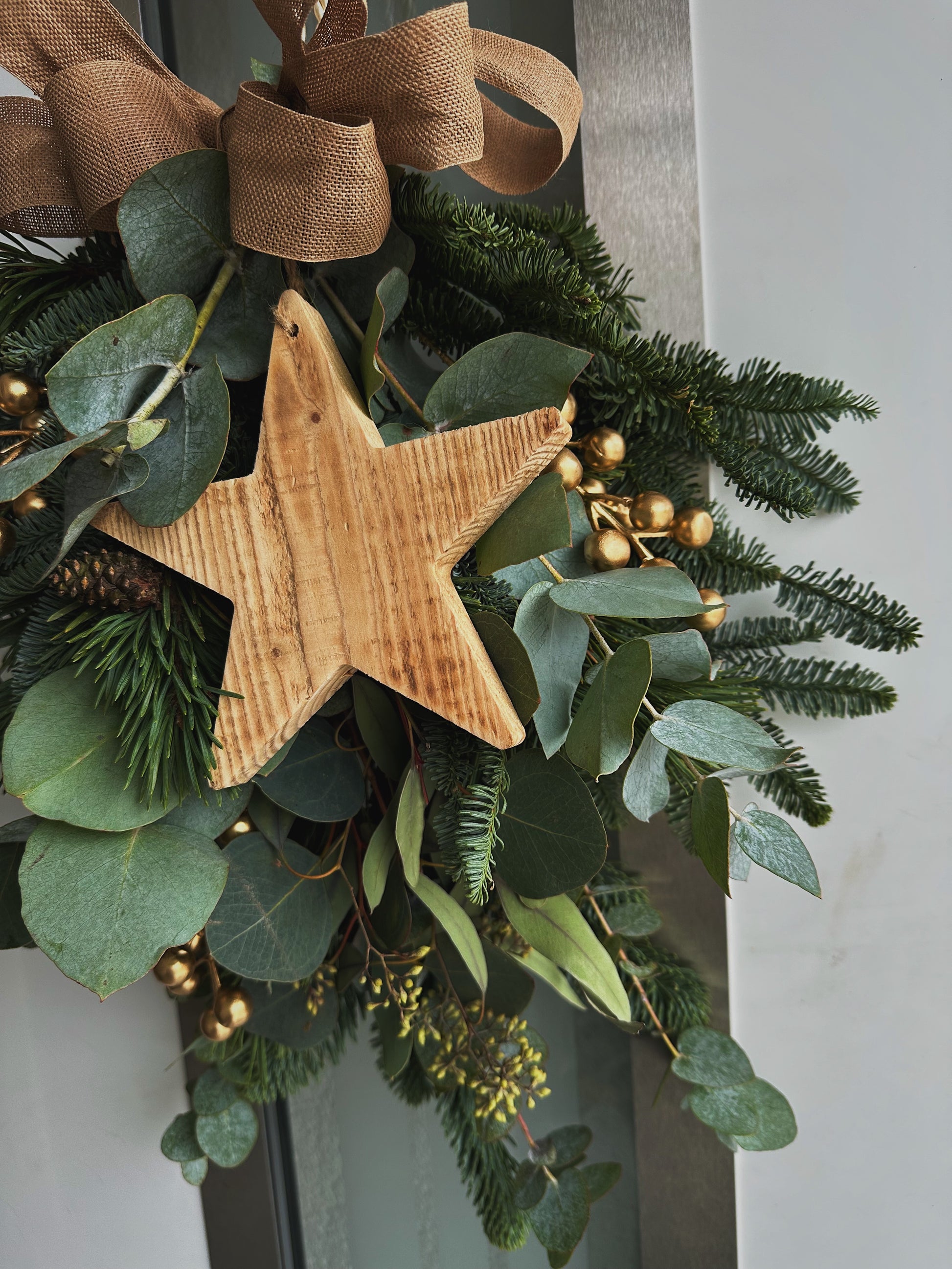 Verschönern Sie Ihre Eingangstür mit unserem Türschmuck Naturliebe. Hergestellt aus Edeltanne und Eukalyptus, verziert mit einem Holzstern, verleiht er Ihrer Tür einen natürlichen und einladenden Look. Bringen Sie die Natur an Ihren Eingang und heißen Sie Gäste mit Naturliebe willkommen.